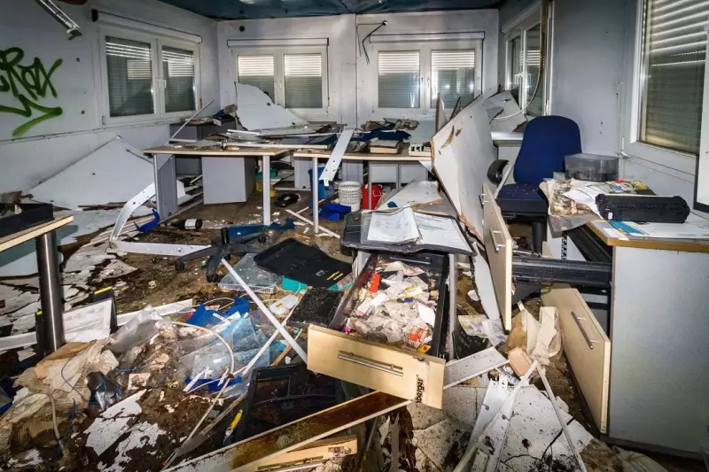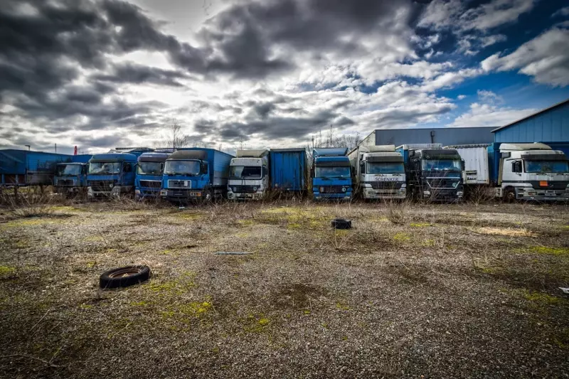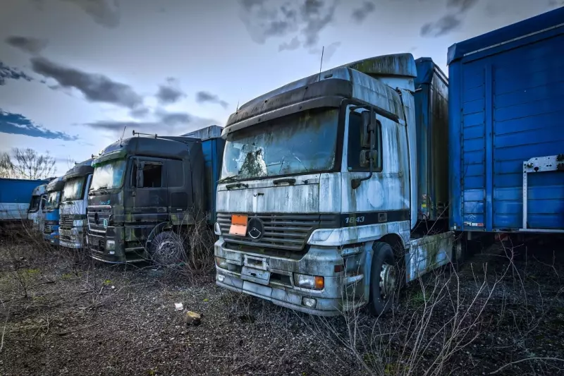 Hinweis: Um diesen Ort vor weiterem Vandalismus zu schützen, habe ich den auf manchen LKWs und der Halle befindlichen Firmennamen per Bildbearbeitung entfernt!